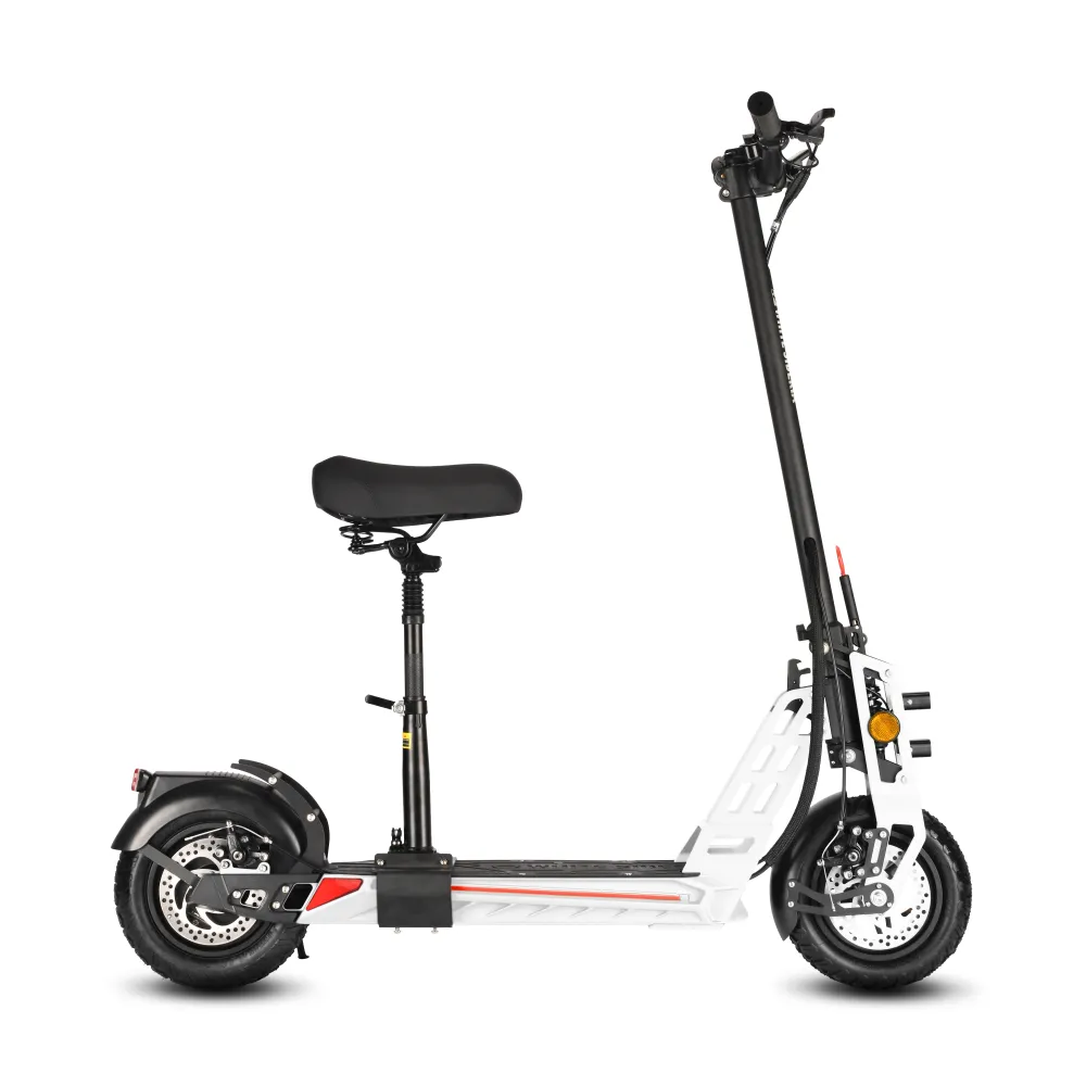 Электродвигатель мощностью 1000 Вт свободно разгоняется до максимальных показателей 45 км/час. Литий-ионный аккумулятор (емкостью 16000 мАч) надежно защищен от механических повреждений. Полного заряда АКБ (8 часов) хватит на прохождение 50 км пути. Амортизационные пружины хорошо смягчают дорожные неровности и дарят полное ощущение комфорта. Складная конструкция и удобное сидение делают его особенно популярным среди райдеров. Резиновые надувные колеса (11 дюймов) рассчитаны на эксплуатацию в городской местности и парковых зонах. Широкая дека 22*47 см позволит пользователю комфортно располагаться при поездках. Дисковая механическая тормозная система предусмотрена отдельно на каждом колесе дарит райдеру полное ощущение безопасности. Для большего удобства поездок на руле расположен переключатель скоростей.